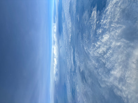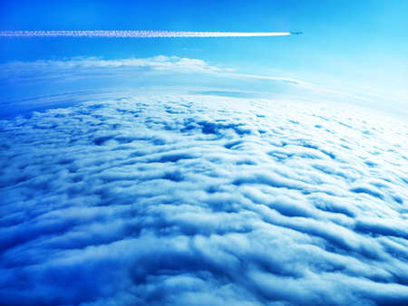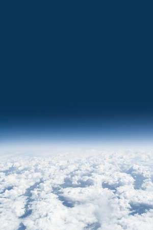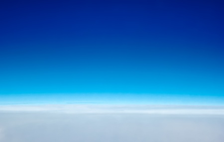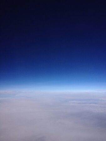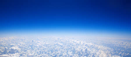 The beautiful cloudscape with clear blue sky. Panorama above white clouds as seen through window of an aircraft. A view from airplane window