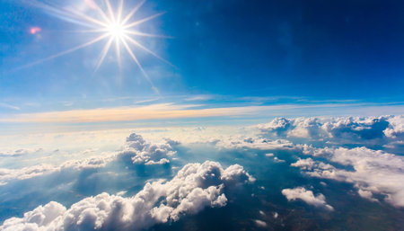 Aerial view of clouds and sun in blue sky. Beautiful nature background