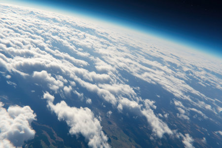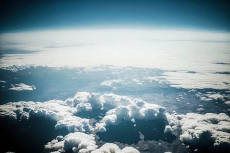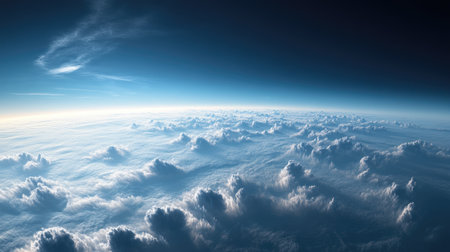 A breathtaking aerial image showcasing the curvature of Earth against the deep blue of space, accentuated by fluffy clouds and atmospheric layers, evoking a sense of wonder.