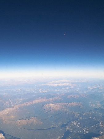 Curvature of planet earth. Aerial shot. Blue sky and clouds over land