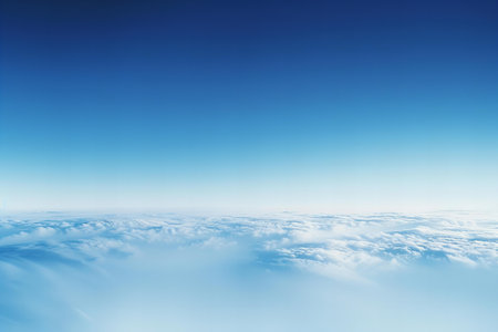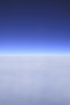 A serene view capturing the horizon where deep blue transitions into lighter shades, set above a blanket of soft, fluffy clouds at dusk.
