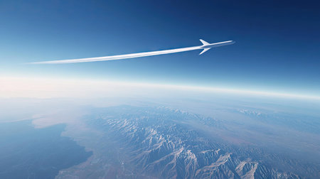 A plane creates glowing contrails as it ascends into the sky, seamlessly blending with the warm hues of the sunset. The atmosphere is vibrant and dynamic, showing nature's beauty.