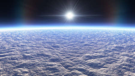 Earth sunrise from space over cloudy ocean. 3d rendering illustration