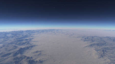 Aerial view of the world at a great height with clouds in the distance and a thin film of white mist covering it