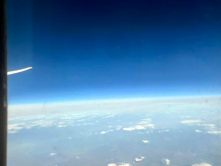 Clouds and sky as seen through window of an aircraft flying above the earth
