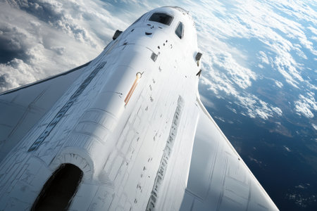 A space shuttle glides high above the Earth, surrounded by wispy clouds in a bright blue sky.