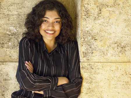 A young woman with dark, curly hair stands facing the camera. Stripes of light and shadow form patterns on the wall. The setting appears urban and modern.