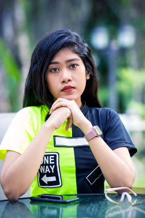 Close-Up portrait of young asian woman posing at the table in cafe