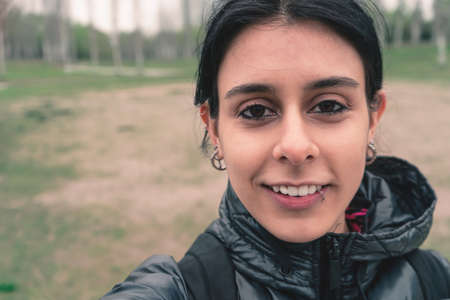 closeup head shot outdoors portrait of An Indian young age female model woman stylish posing outside nature profile side view attractive beautiful face