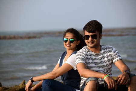 Happy young couple sitting on the coral in the sea beach enjoying the honeymoon time. Romantic time passing by lovers sitting side by side