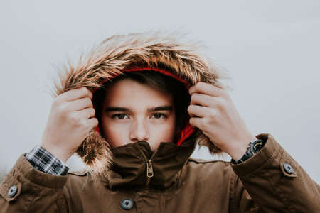 portrait of a boy sheltered in winter