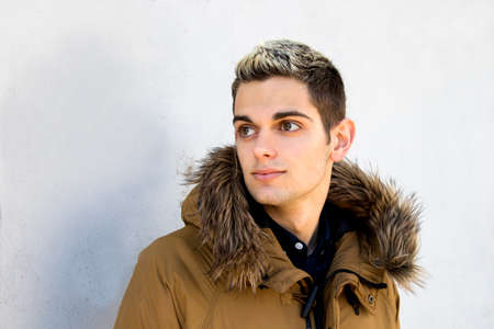 Young man in a yellow down jacket on the background of colored wall