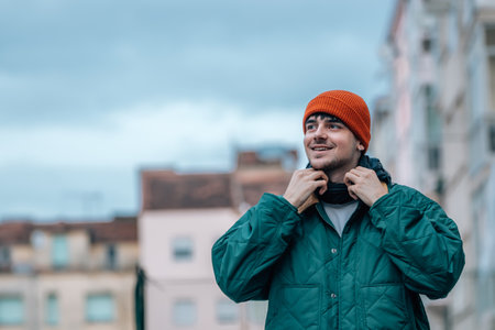 portrait of young man on the street in winter warm and wearing a hat