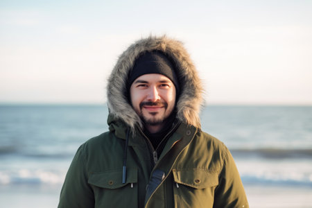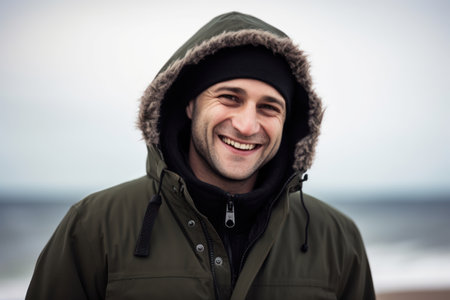 Portrait of a smiling young man in winter jacket at the beach