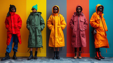 Colorful Urban Fashion Display Featuring Models in Stylish Outerwear Against Vibrant Wall