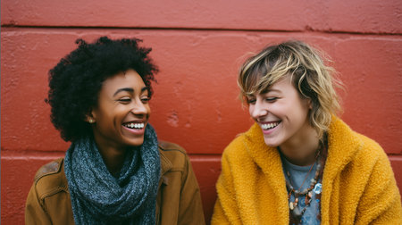 Two friends laughing together against a vibrant red wall in a cozy urban setting during the afternoon