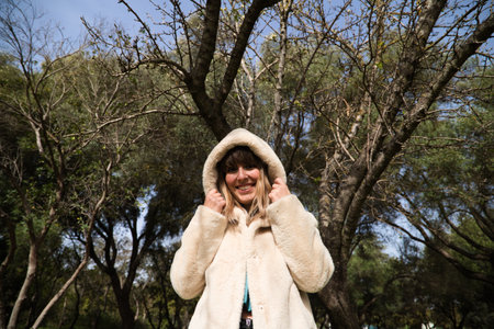young and beautiful blonde woman dressed in jeans, coat with white cap and boots is walking in the park and is having her photo taken while enjoying the sunny day among the trees. Free time concept.