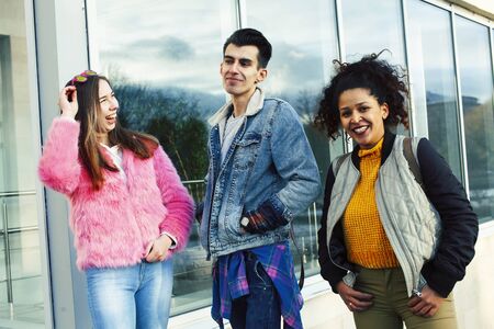 Multiethnic group of young hipsters stands together on street against gray brick wall. Diverse Stylish people in outerwear outdoor, youth culture