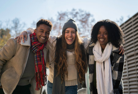Three happy young friends are smiling and enjoying each other's company outdoors in winter
