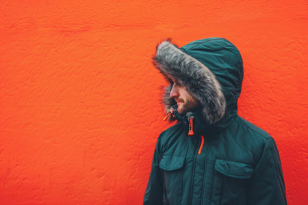 Bundled up for warmth, a man gazes thoughtfully to the side while leaning against a bright orange wall. The cold weather is evident as he braves the elements in his stylish outerwear.