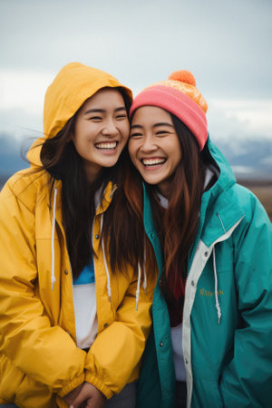 Two young Asian women in yellow jackets and hats standing on the top of the mountain and smiling.