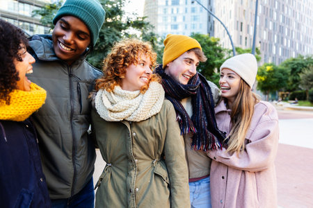 Multiracial group of young happy friends meeting outdoors in winter, wearing winter jackets and having fun - Multiethnic millennials bonding in an urban area, concepts about youth and social releationships