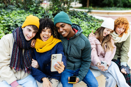 Best friends taking selfie on warm fashion clothes - Happy lifestyle concept with millenial people having fun together - Everyday life of next generation guys and girls enjoying friendship outdoors