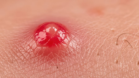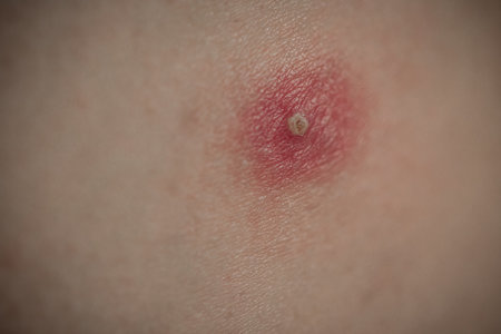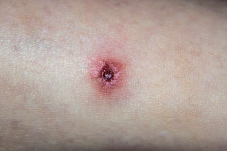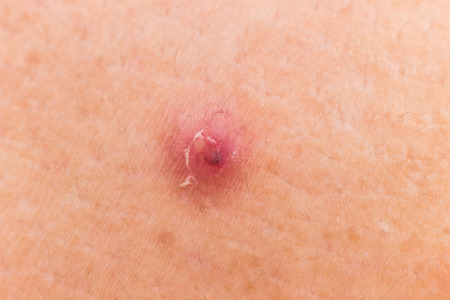 Infected and closed skin glands by staphylococcus. Bulge in skin due to infection, rash, with white top and red surround