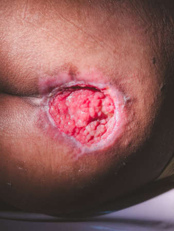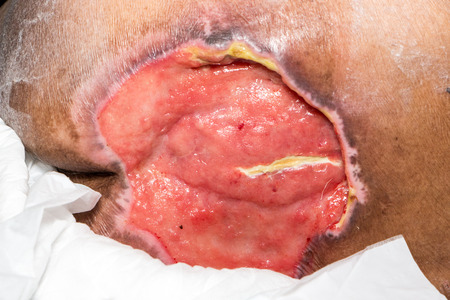 Pressure injury stageIV.Bedsore pressuresore bedridden.HealthCare and Medical Concept.