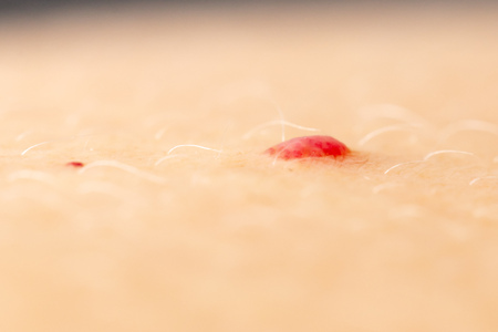 Torn wound from inflammation, acne on the human skin. Red infected wound on the normal skin of human leg. Torn off a bleeding pimple on the skin.