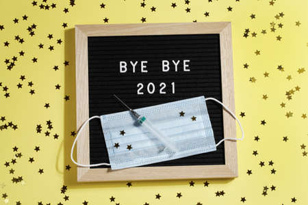 black letter board with text BYE BYE 2021 with small stars, syringe and mask on yellow background. Happy new ear 2022 concept.