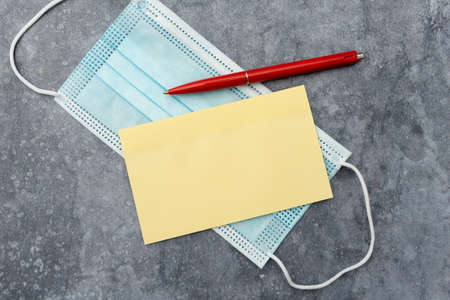 Medical concept with sticky note, pack of capsules, face mask, injection, sticky note on blue desk backgroud flat lay. doctor writing with pen.