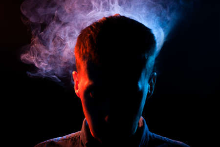 The man's face is hidden in the shadows on a black isolated background with red and blue smoke from the vape. Extraneous thoughts.