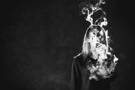Woman covered in smoke and wearing a mask. Health hazard concept. Toxic influence of smoking addiction.