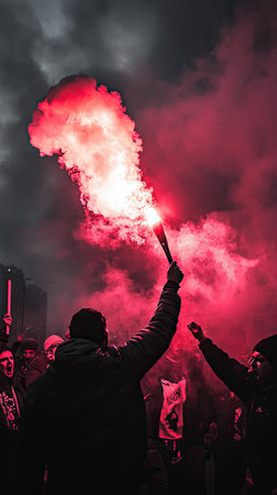 A group of enthusiastic supporters demonstrates their passion late at night, waving flares and blowing whistles as they celebrate