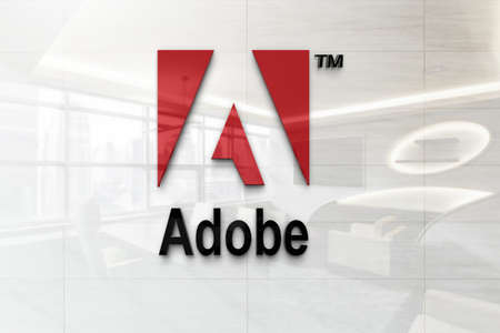 Bucharest, Romania - 02.13.2021: Adobe Inc offices in Romania. Logo of the American multinational computer software company Adobe on a building