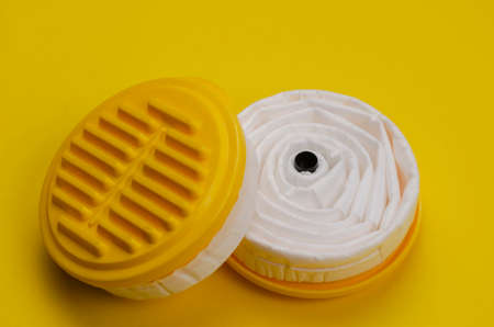 New replacement filters for Industrial respirator on yellow background. Personal respiratory protection equipment. Production safety. Close-up. Selective focus.