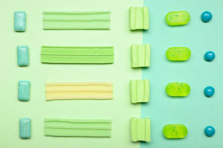 Different chewing gums on color background