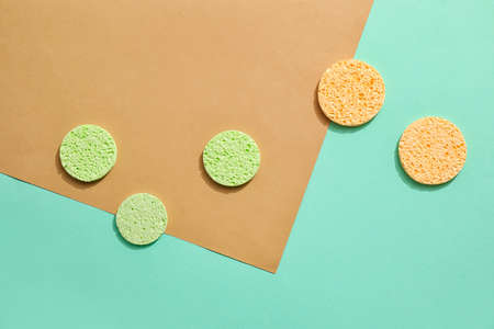 Three round yellow facial sponges on a green background. skincare accessories. Flat lay, copy space