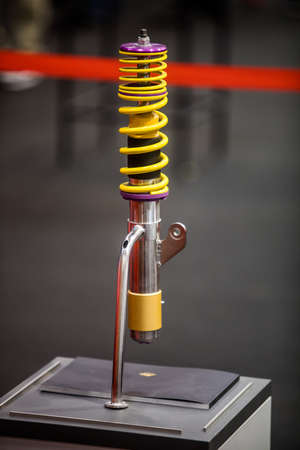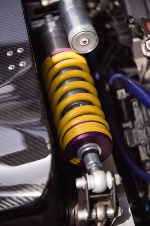 Close up shot of new a motorcycle shock absorber with a yellow spring.