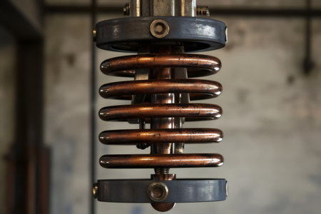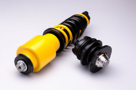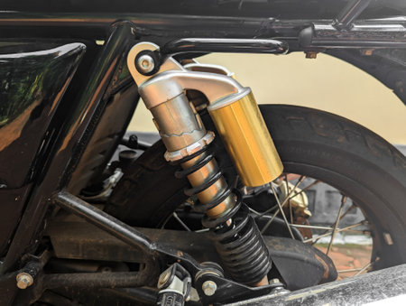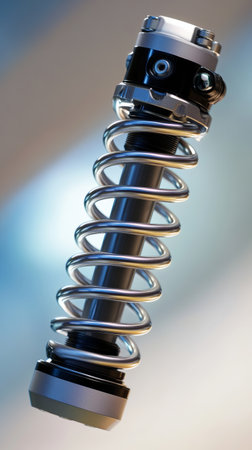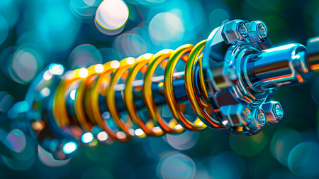 Detailed view of a shock absorber and suspension system showcasing its engineering and mechanics. Ideal for automotive and technology projects.