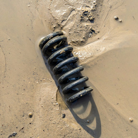 A forgotten industrial spring, rusted and weathered by the elements, lies half-buried in the wet sand.