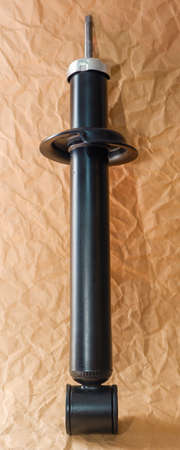 New car shock absorber on a background of crumpled kraft paper.