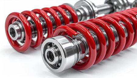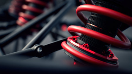 This close-up image showcases a red coil spring suspension component, emphasizing intricate details and precision in automotive engineering and design.