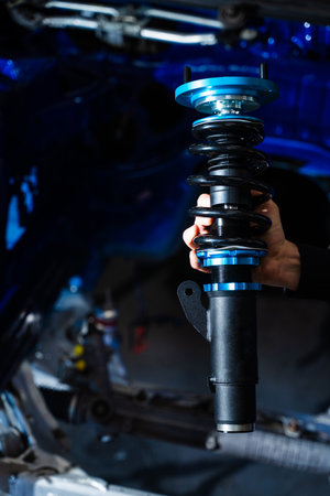 Auto engineer mechanic working on car shock absorber in car service workshop