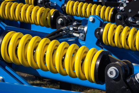 Steel yellow spring as detail and part of heavy agricultural or industrial machine. Technology