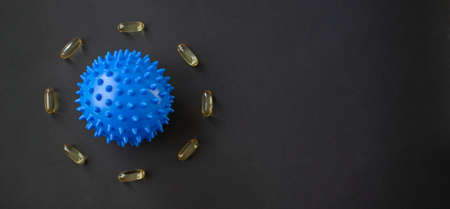 Syringe, medical supplies, virus strain on blue background. Vaccination. Coronavirus; n-cov2019. Top view