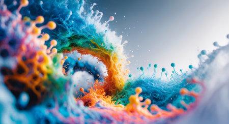 A background with vibrant colors and holographic texture displays a flowing liquid splash in various hues