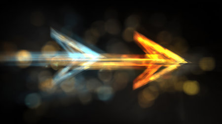 Dynamic arrows in blue and orange colors create sense of movement and direction against dark background, evoking energy and contrast. blurred effect adds depth and excitement
