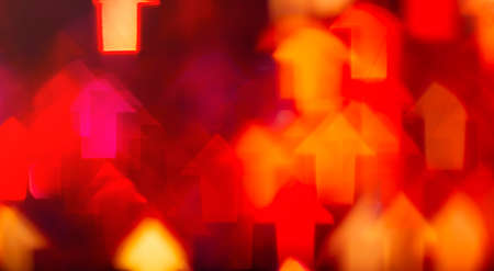 Glowing red arrow on wet reflective surface with abstract bokeh lights in background. Futuristic direction and progress concept